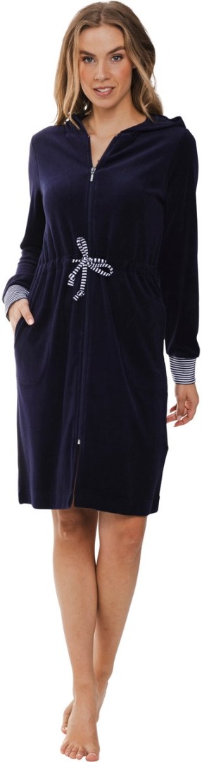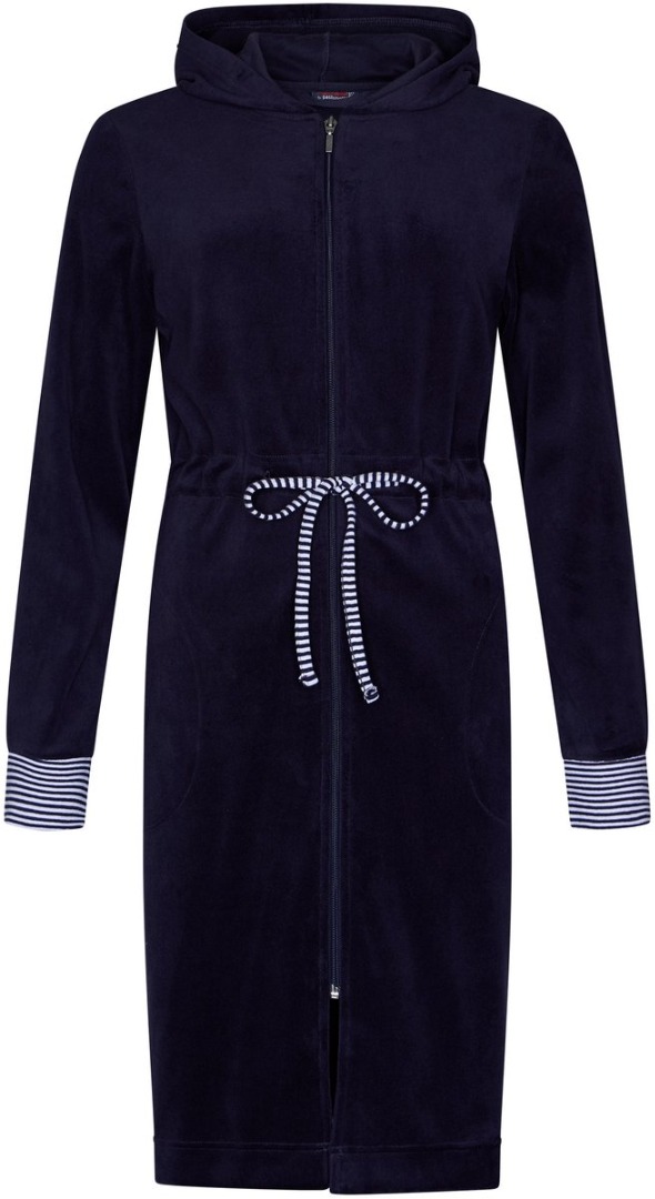De ochtendjas is uni donkerblauw van kleur. Het is een ritsmodel met capuchon en heeft wit met donkerblauw gestreepte boordjes aan de mouwen. Leuk detail zijn de diepe steekzakken en het wit met donkerblauw gestreepte koordje in de taille.