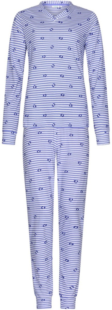 De set is lichtpaars met sneeuwwit gestreept en heeft een all-over animalprint in het paars. De top heeft lange mouwen met boordjes en een speelse V-hals met het streeppatroon in een andere richting. De broek heeft een elastische tailleband voor een optimale en comfortabele pasvorm.