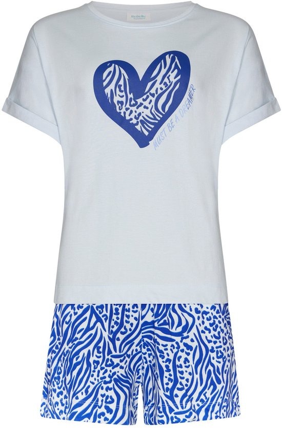 De top is uitgevoerd in een zachte, lichtblauwe tint en heeft een opvallende hartprint met een subtiele animal touch. De cut-on korte mouwen en ronde hals geven het geheel een nonchalante, vrouwelijke uitstraling.